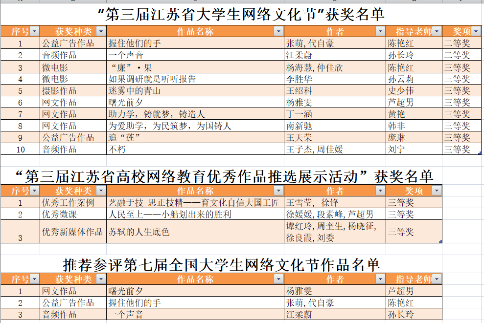 近日,省委教育工委、省教育厅公布了第三届江苏省大学生网络文化节和高校网络教育优秀作品推选展示活动获奖名单,我校师生喜获二等奖2项、三等奖11项。3项作品被推荐参评第七届全国大学生网络文化节。